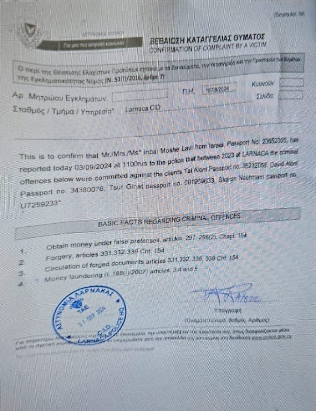 Official police complaint filed against Savvas Kakos at the Larnaca District Police Station